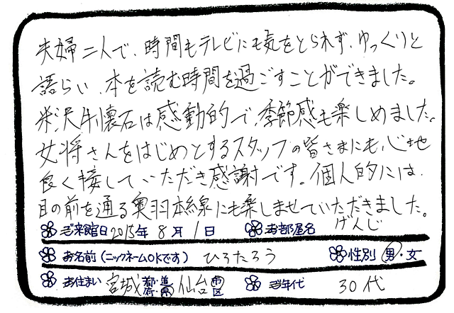 「夫婦でゆっくりと語らい、本を読み過ごす。米沢牛懐石は感動的♪」