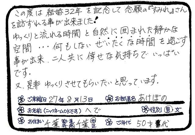 「結婚32周年を記念して念願の”すみれ”に♪」何もしない贅沢な時