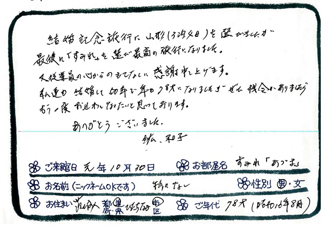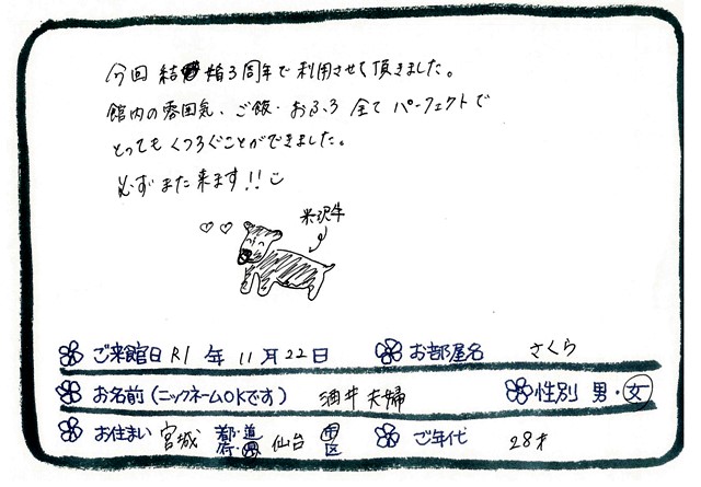 「結婚記念旅行に”すみれ”を選び最高の旅行になりました」米沢牛を