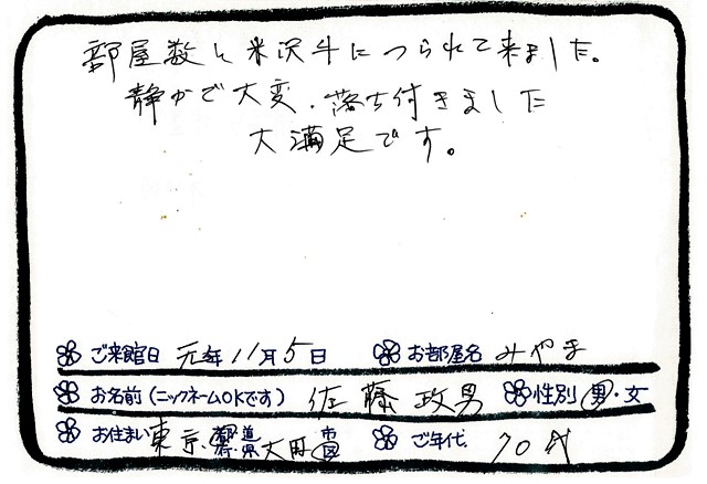 「結婚40年、二人でいい思い出作りに来ました」温泉と米沢牛料理を