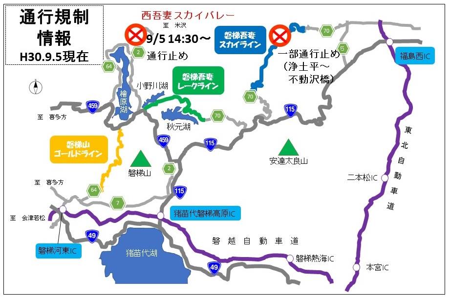 只今西吾妻スカイバレーは通り抜けできません。国道121号または1